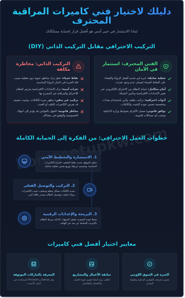 لهذا السبب، قمنا بإعداد هذا الدليل الشامل. سنأخذ بيدك خطوة بخطوة لتتعرف على كل ما تحتاجه، بدءًا من فهم أنواع الأنظمة المختلفة وكيفية اختيار الأنسب لاحتياجاتك، وصولًا إلى معايير اختيار أفضل الفنيين في الكويت. ستتعلم كيفية ضمان تركيب احترافي، وتجنب أي مفاجآت في التكلفة، والأهم من ذلك، كيفية تشغيل نظامك الأمني بسهولة وثقة. هدفنا هو أن تتخذ قرارًا مستنيرًا يمنحك نظامًا عالي الجودة وشعورًا بالطمأنينة الحقيقية التي تستحقها.